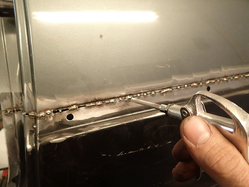 Zanim mogliśmy wspawać z powrotem przednią część progu musiałem wyczyścić od wewnątrz miejsca, w których przyspawane sa fabrycznie zawiasy drzwi.